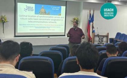 Durante la actividad, el expositor abordó uno de los desafíos claves de las telecomunicaciones móviles: La sincronización precisa de tiempo y frecuencia en las estaciones base. En base a esto, expuso un modelo que determina el número y la ubicación óptima de servidores de sincronización, asegurando asignaciones primarias y secundarias robustas para cada concentrador de radio base y minimizando los costos de instalación.